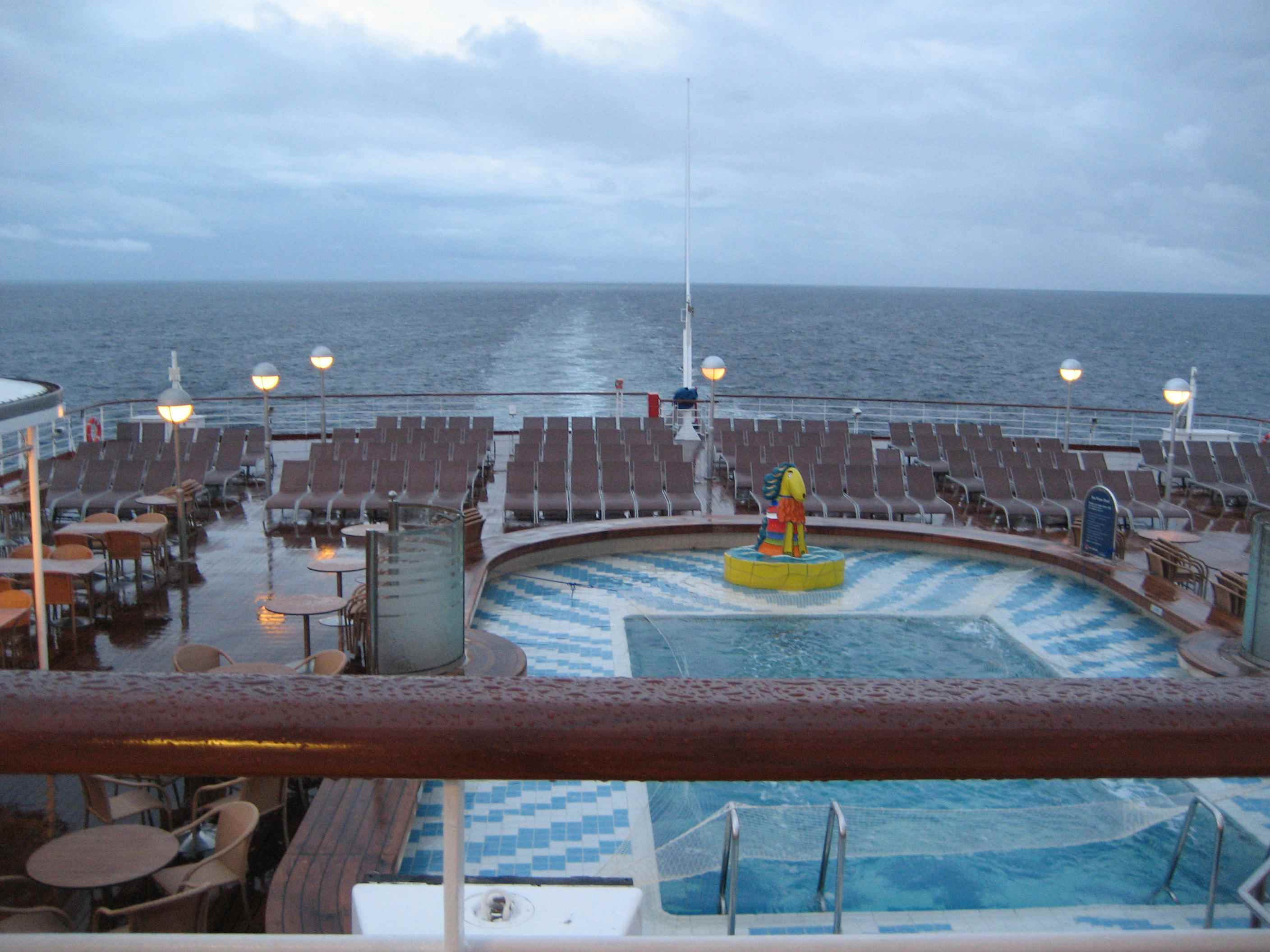 デッキが濡れているのは、夜雨が降ったのかと思いましたが、クルーがあちこちで甲板を水洗いしていたのでそのためかもしれません。