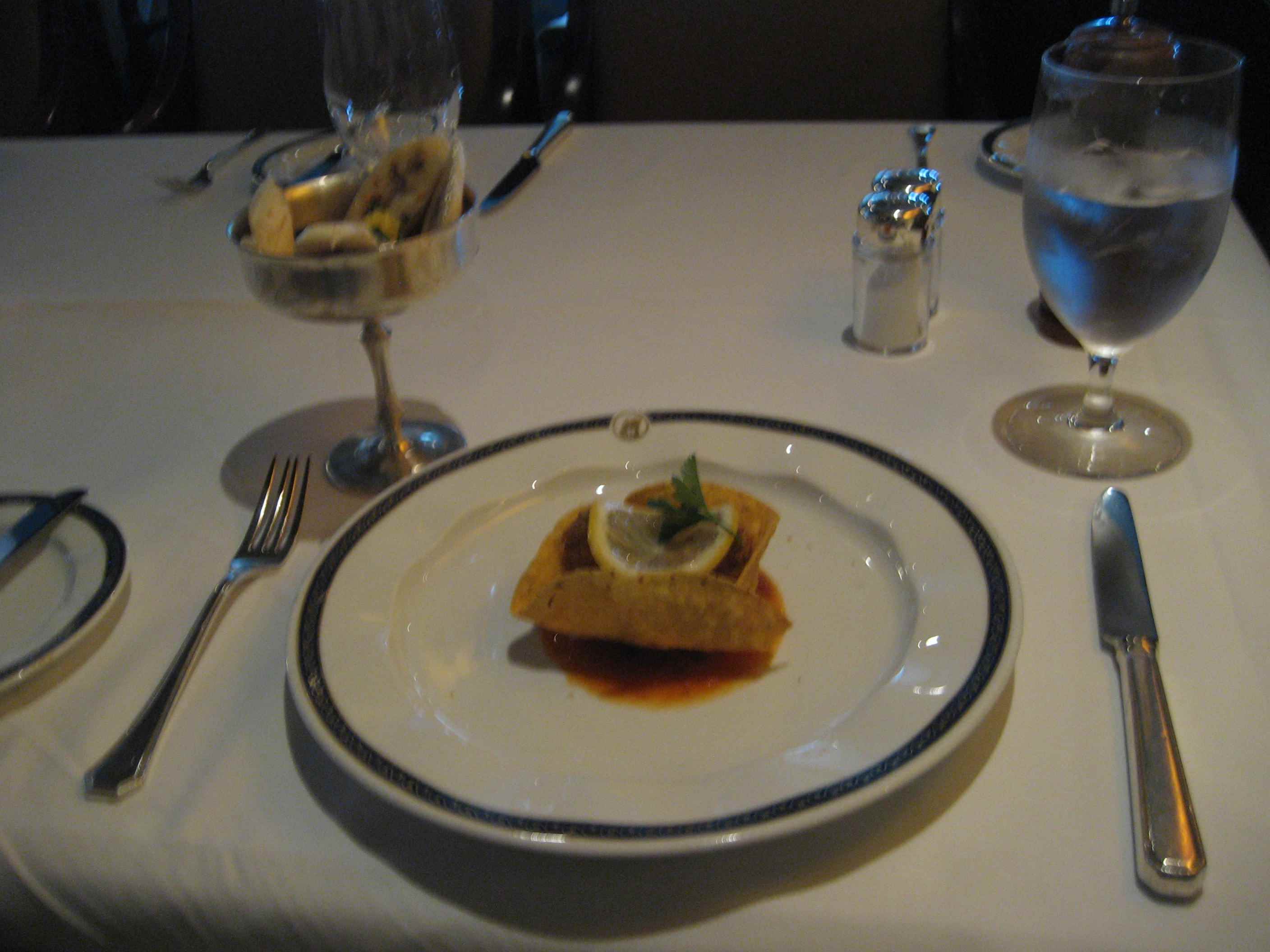 私は、前菜から「バナナとオレンジのバルサミコソースがけ」と「イカの揚げ物」の2つを選び、スープ&サラダから温かいスープを、メインは「焼きパスタ」を選びました。
