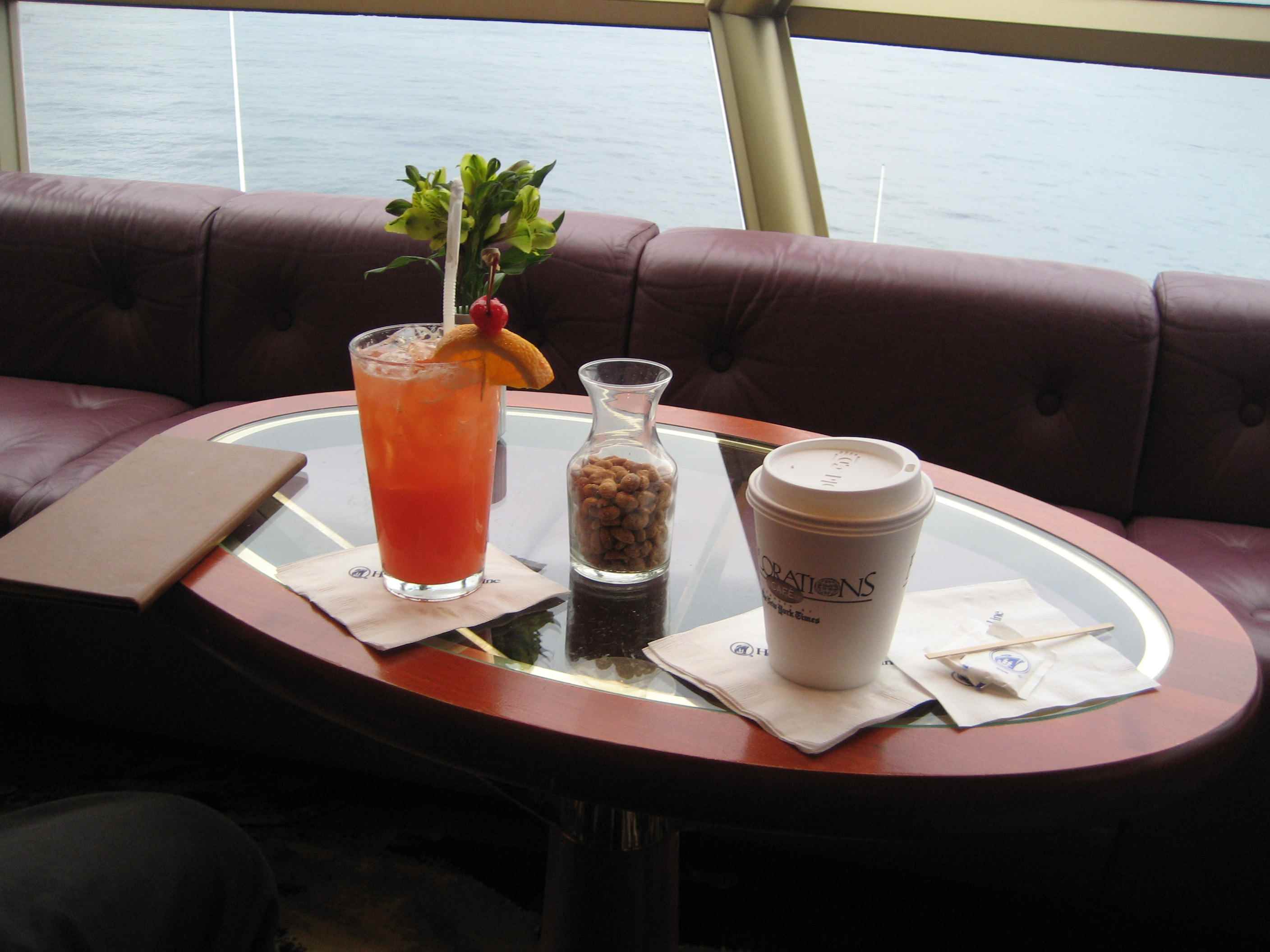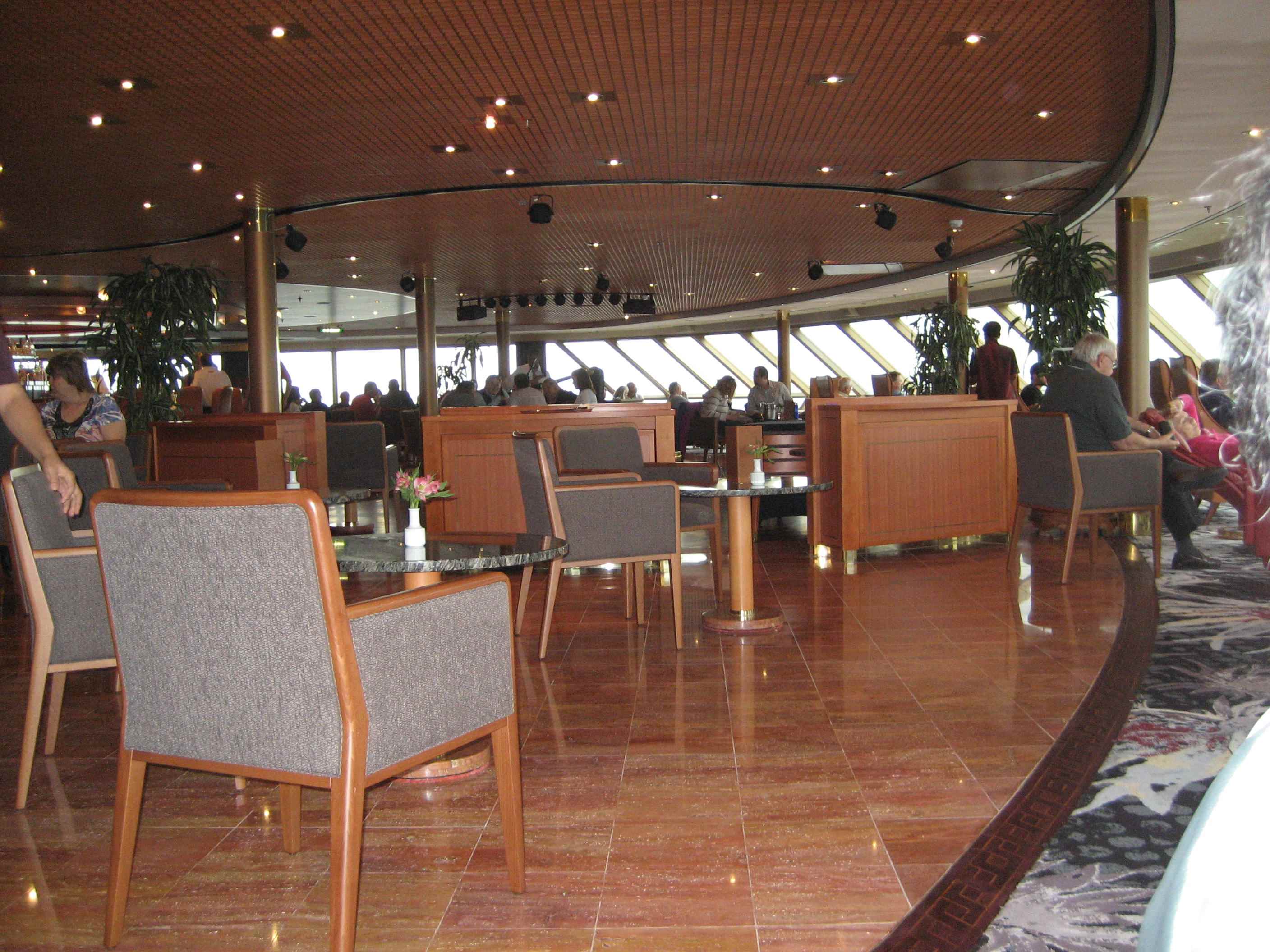 ここは船首の最上階にあり、ぐるりとガラス張りになっていて、ソファやリクライニングチェアが並んでいます。