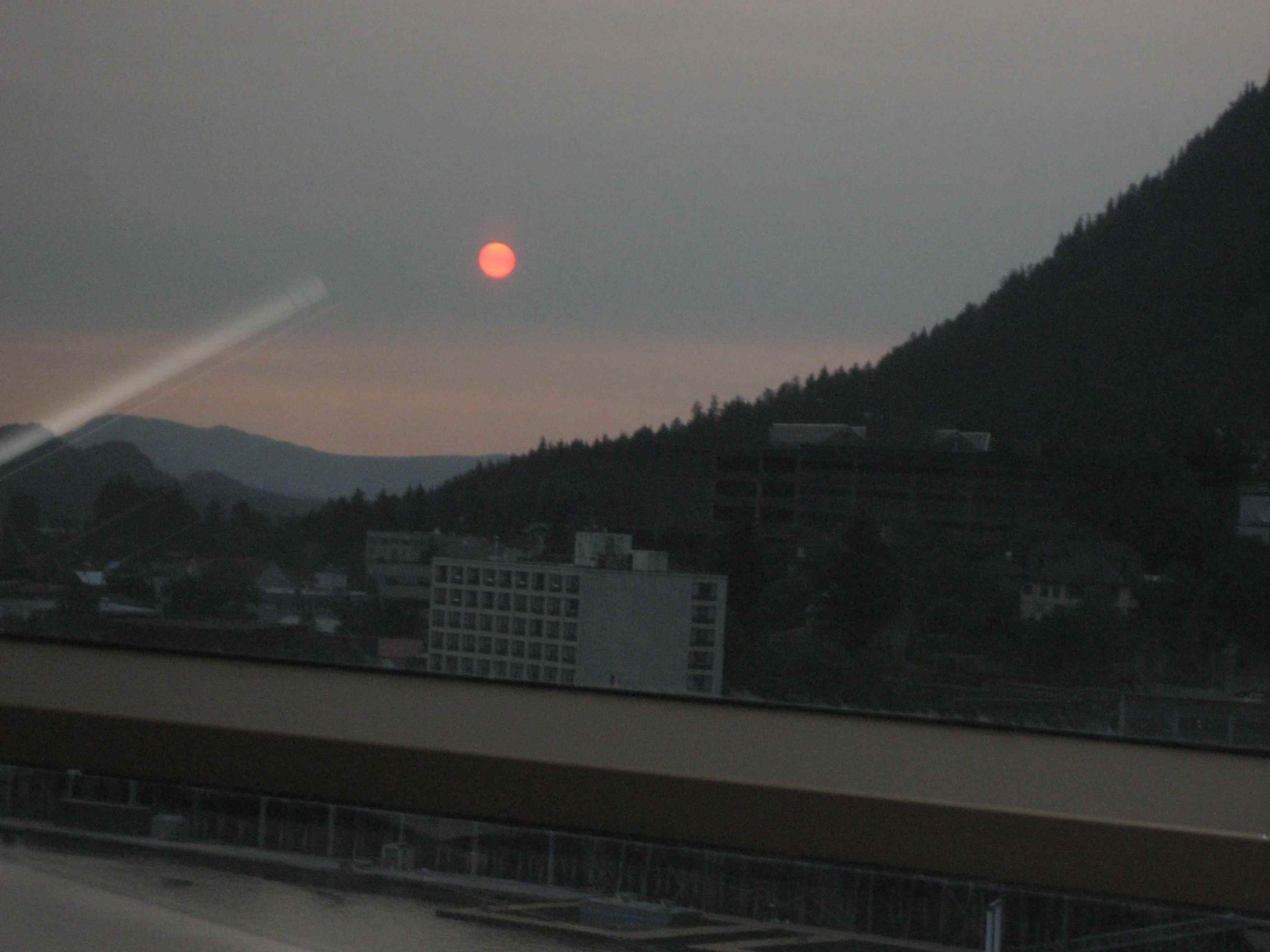 船に戻ると、山へ沈む夕日がまんまるに見えて、とても綺麗でした。