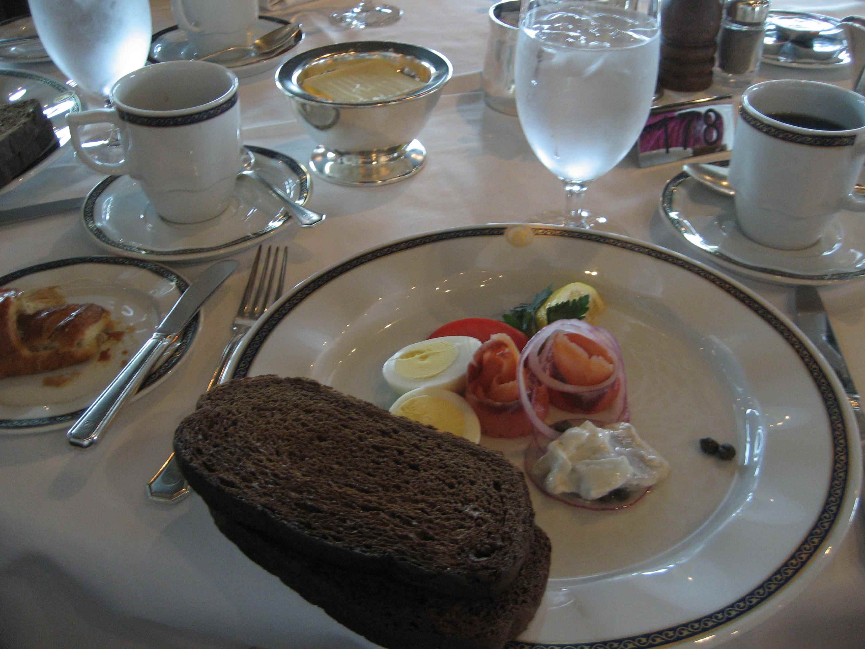 黒パンにスモークサーモンとゆで卵にサラダです。