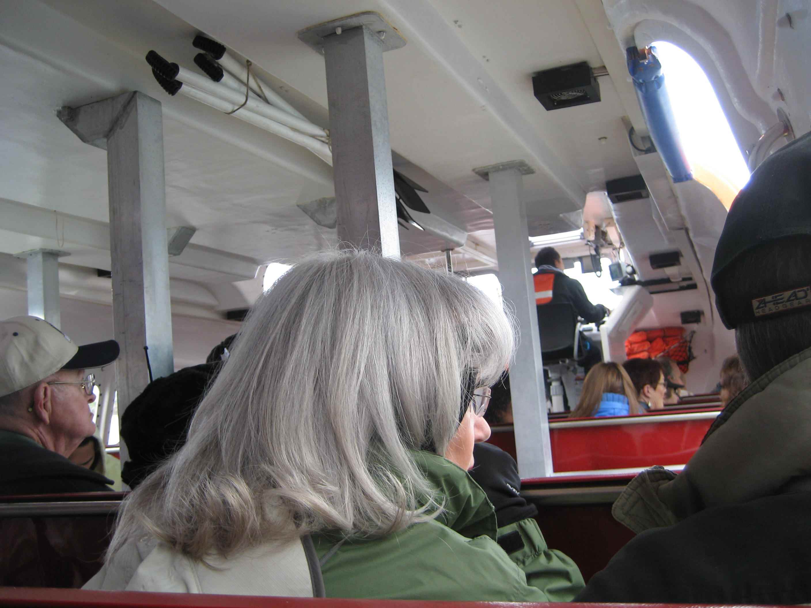 最初、このボートは港に用意されているのかと思ったのですが、よく見ると船の両脇に吊り下がっています(写真はガラス越しなので見難いですが)。