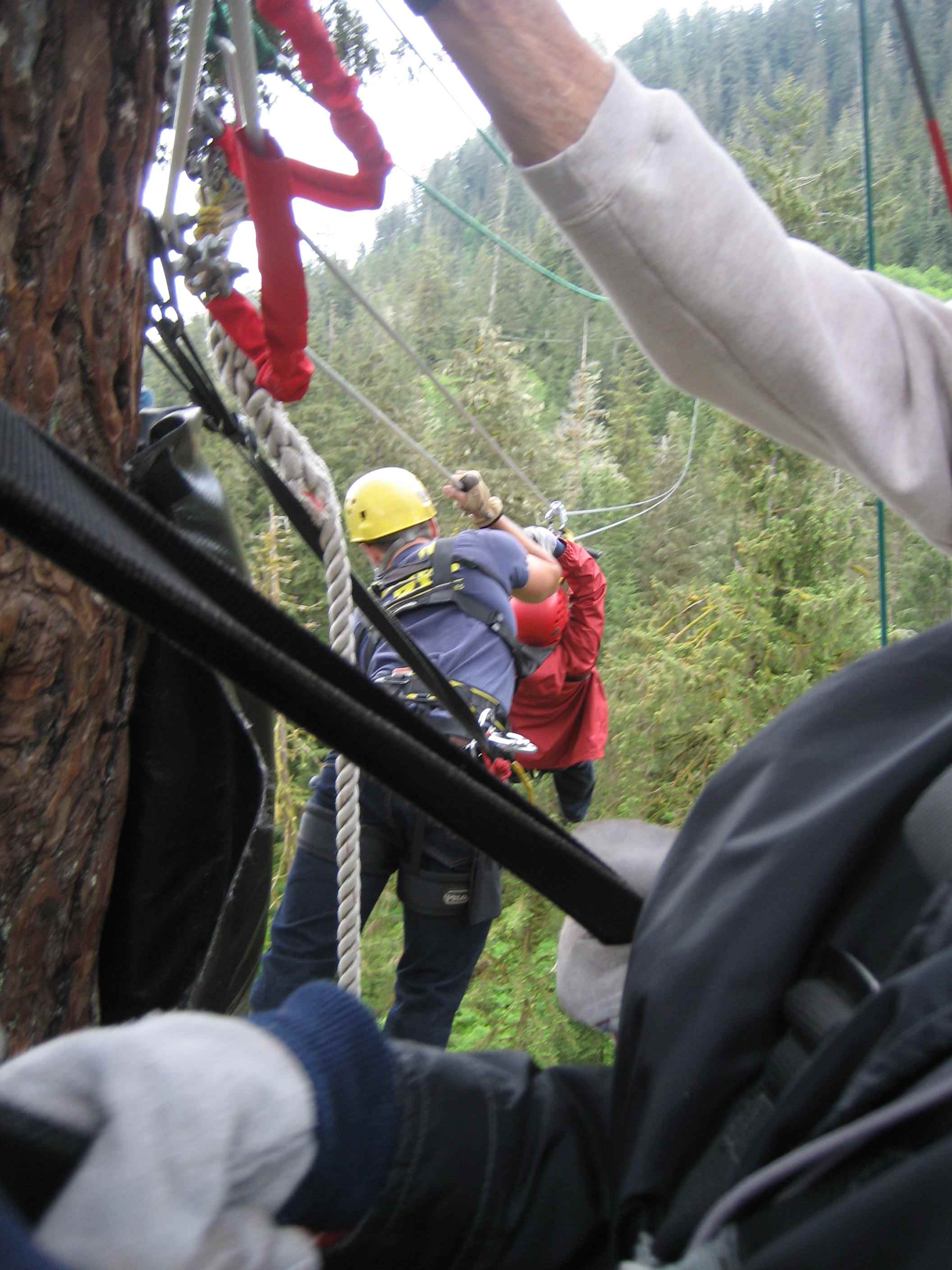 台に乗って、木に渡したロープに滑車を取り付けます。
