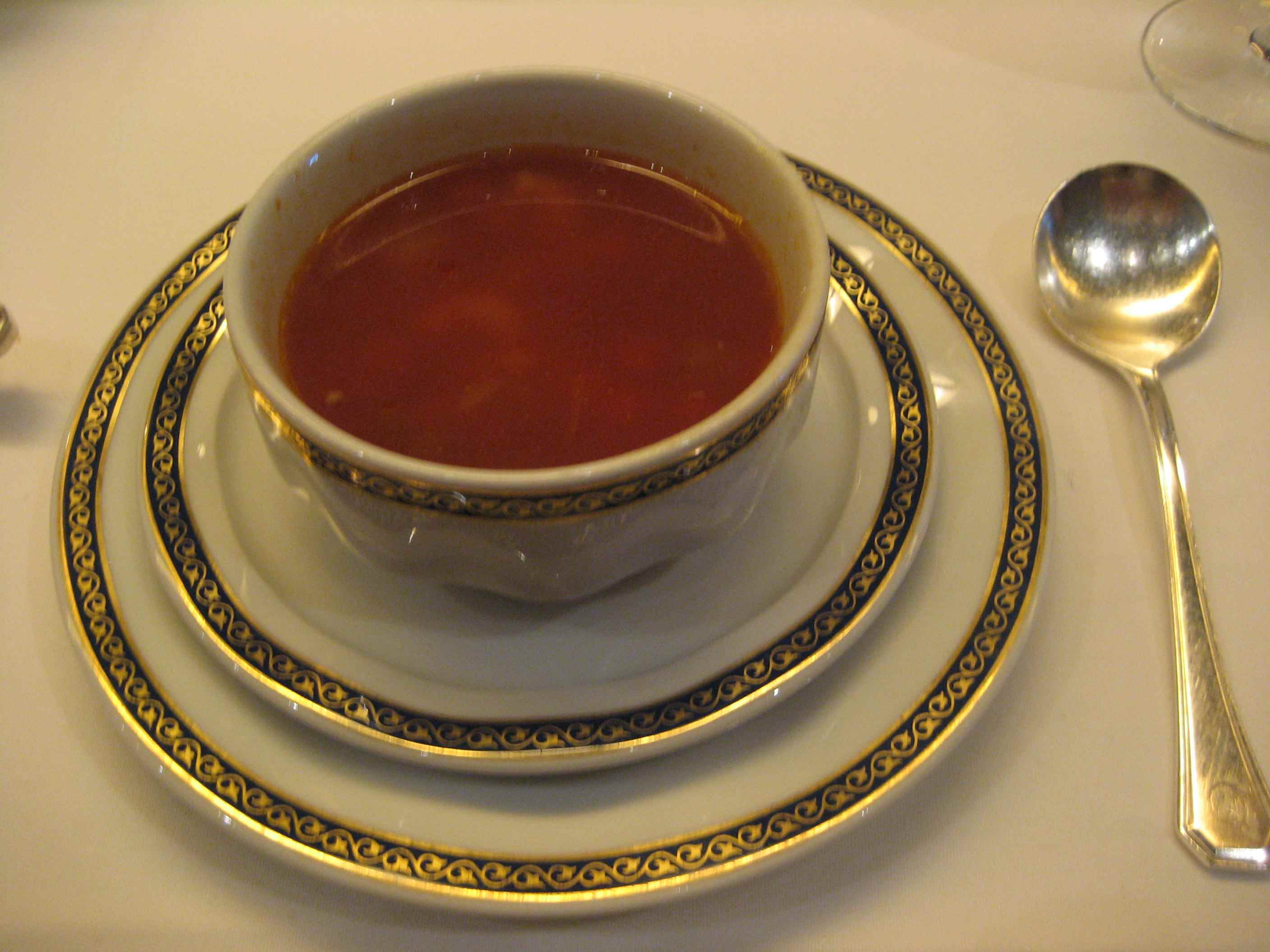器の中がトマトのソースで、向こうにサーモンがあります。