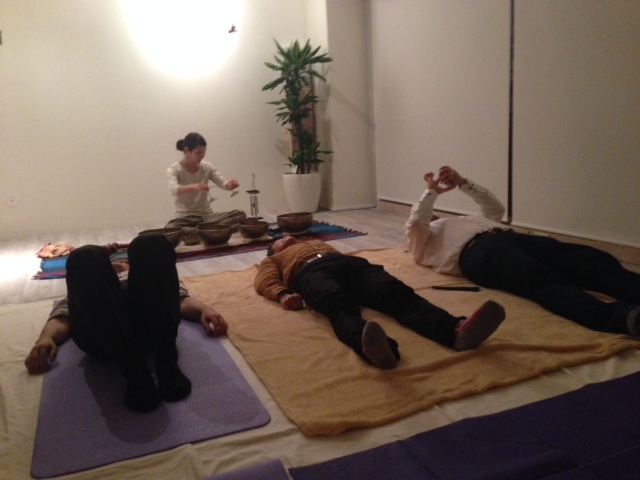 10月10日にシェアビズ渋谷Blossomで開催されたシンギングボウル演奏会では、床に横になってKuri(くり)ちゃんの演奏するシンギングボウルを体全体で味わいました。
