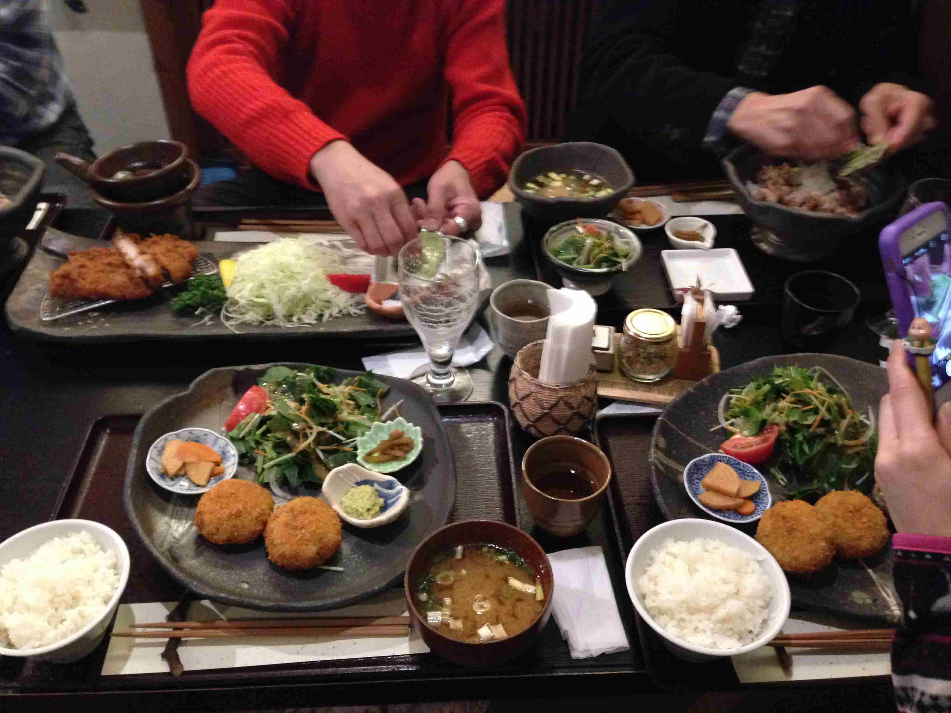 向かい側の赤い服の人(今回の大人の遠足を企画した風間さん)が食べているのがトンカツ。