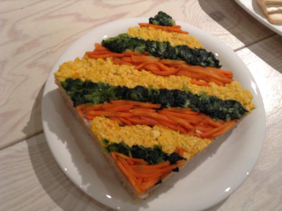 これが、彩りのよい野菜の乗った押しずし(玄米)です。