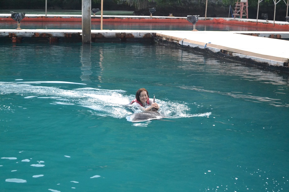 その後、水着に着替えてシュノーケリングの準備をして、イルカと同じプールに入ります。