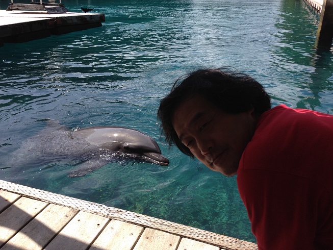 眠そうな夫とイルカの2ショット。
