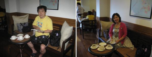 私たちはベンチタイプのイスで、お茶とお菓子をいただきながら搭乗を待ちました。