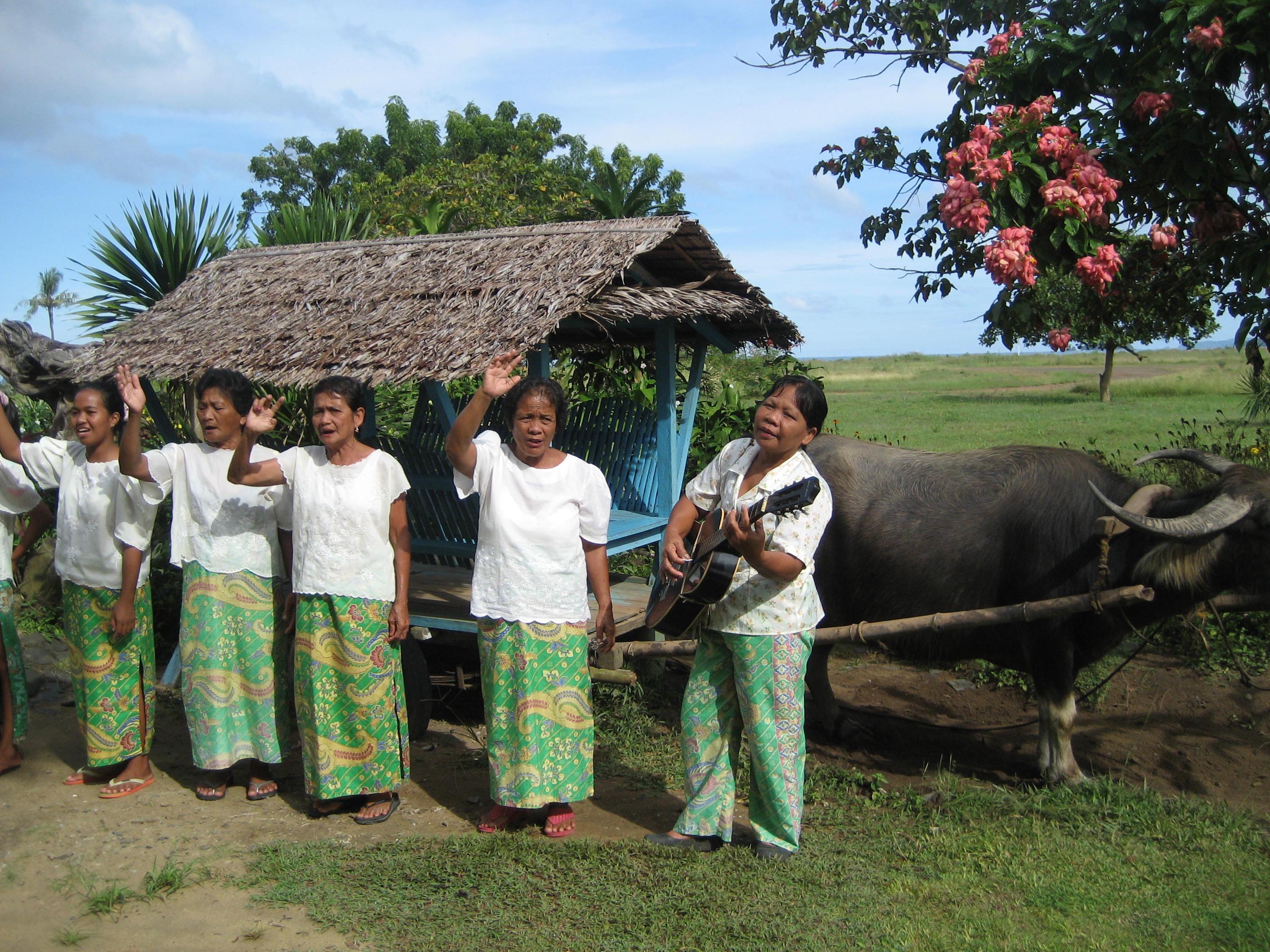 飛行機を降りると、水牛の引く車の前で数人の女性が出迎えの歌を歌っています。