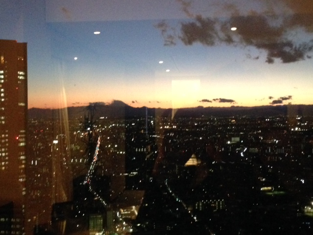 ちょうど、今、夕日が雲間に落ちるのを見ながら、東京の街を眺めています。