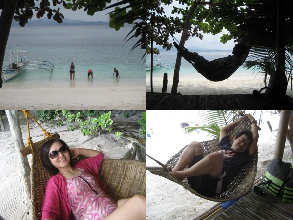 屋根付きのビーチマットとハンモックがセットになった休憩所がいくつかあり、そのうちの1つを確保します。